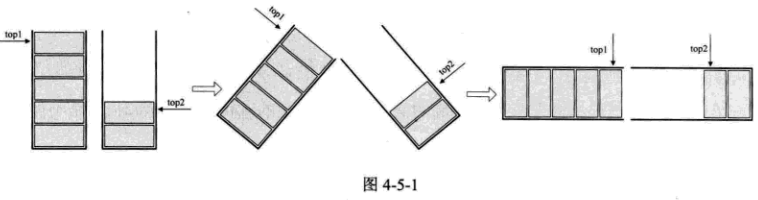 关键思路:它们是在数组的两端,向中间靠拢。 top1和top2是栈1和栈2的栈顶指针,可以想象,只要它们俩不见面,两个栈就可以一直使用。