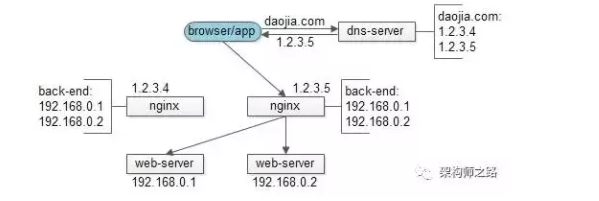 典型的互联网架构中,可以通过增加web-server来扩充web层的性能,但反向代理nginx仍是整个系统的唯一入口,如果系统吞吐超过nginx的性能极限,难以扩容,此时就需要dns-server来配合水平扩展。